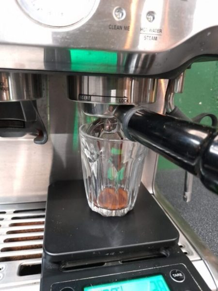Now it’s time to pull a test shot. Lock your portafilter into the showerhead of the machine and grab your set of scales again. Place your cup underneath the spouts of your portafilter, tare off the scales and press the double shot button on your machine and start a timer at the same time. We are now aiming for an overall brew time of between 25 seconds to 30 seconds (dependant on the coffee), with an overall output of around 40 – 45g in the cup. Don’t be alarmed if on the Barista Express the pressure gauge is past the ‘espresso range’ and the coffee doesn’t start pouring from the spouts in the first 9 seconds, this is doing something called pre-infusing.